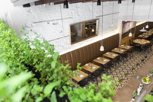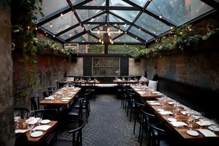 A 600 square foot retractable atrium in a brownstone Garden with Cobblestone floors to conjure the feeling of escape to another world on a small side street in almost and European village. The concept was simple, simple foods done exceptionally well with specificity to the home town in which it derived, all cooked in a brick oven or over solid fuel. This Regional European Bistro was a Bellwether of the next wave of comfort food in NEW YORK