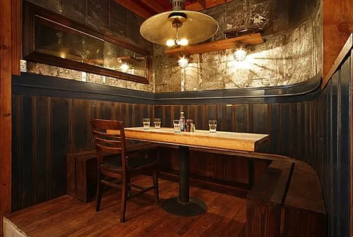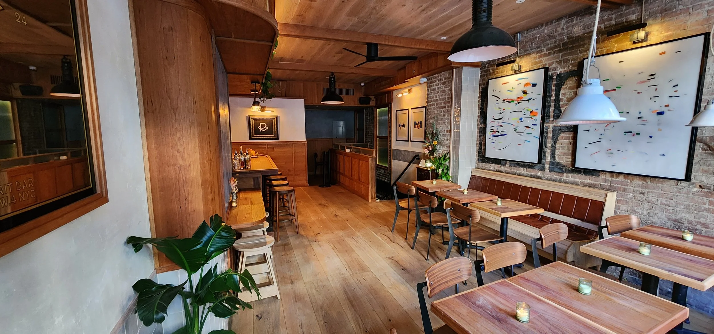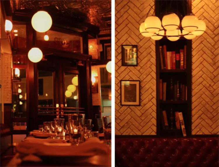 Our exciting discovery of beautiful original tiled floors and a central ceiling feature hidden under many layers inspired the palette that would be used throughout. The room encompasses custom designed and built furniture, lighting and hardware. A sectioned-off area at the back created by an antique door frame from an Old NY Brownstown as is most of the millwork makes for an intimate dinner or private party. The large glass windows and 18 ft bar that stretches the length of the triangular space create an inviting ambience from blocks away.